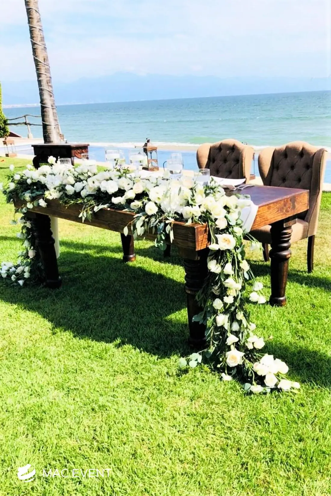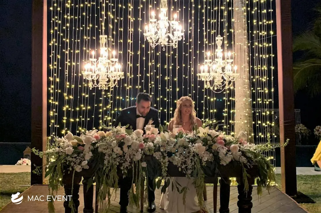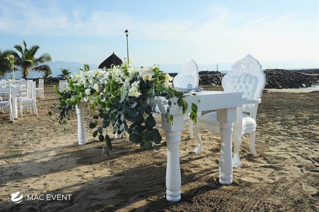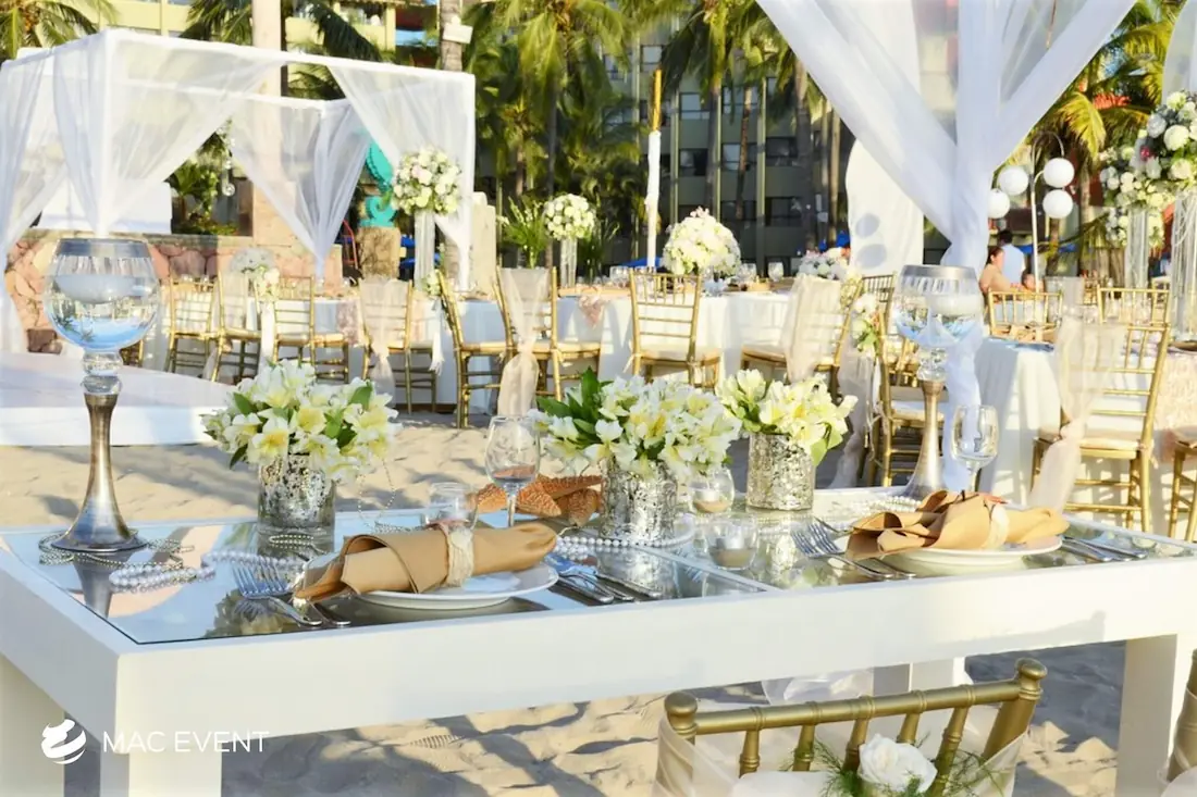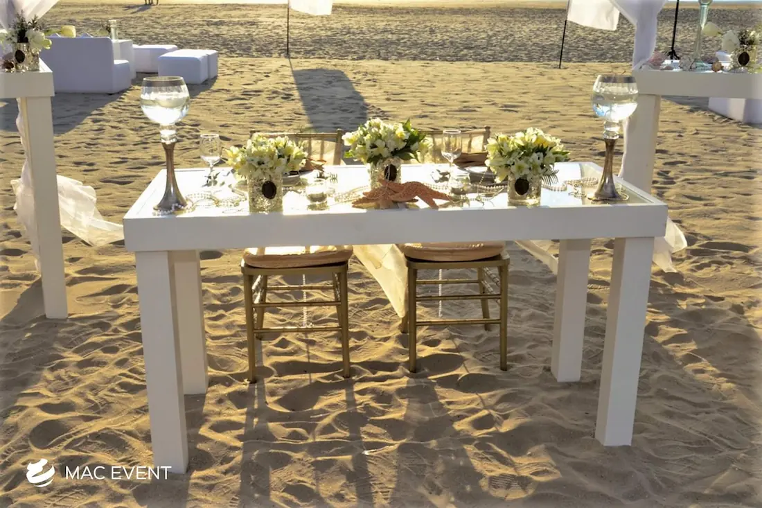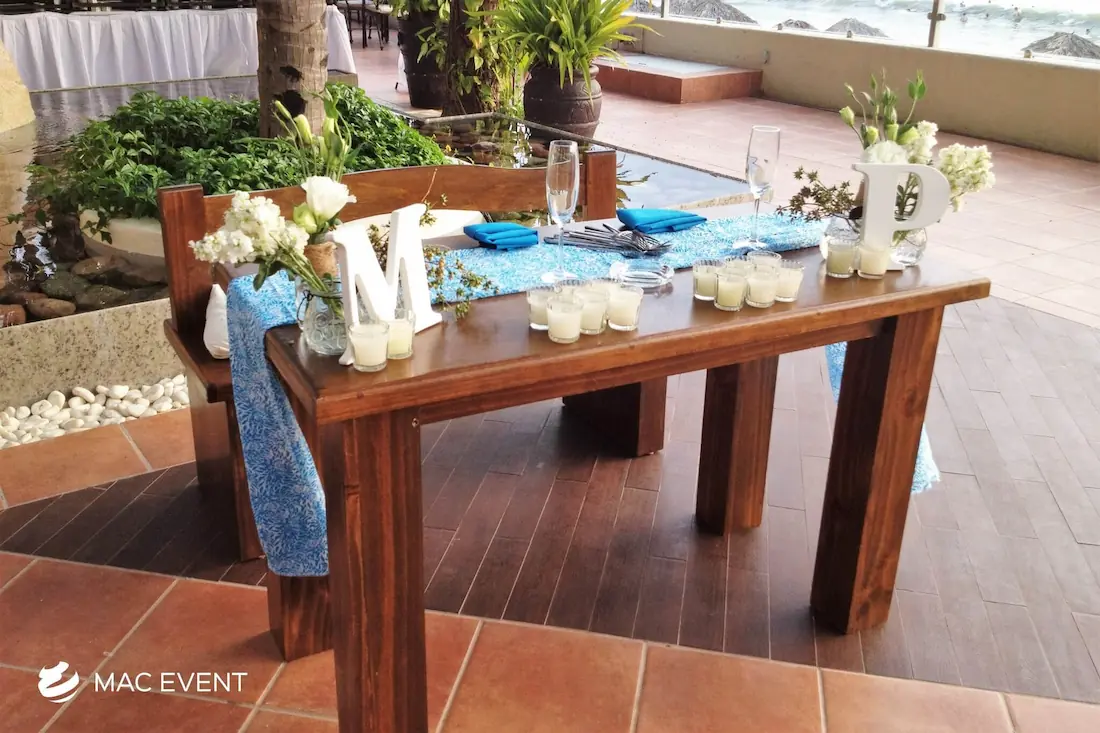 The sweetheart table is a romantic focal point at weddings in Manzanillo, designed exclusively for the newlyweds to share their first moments together as a married couple. This wedding table rental combines elegance and intimacy, often highlighted with floral arrangements, candles, and personalized décor that reflect the couple’s style. Positioned at the center of attention, the sweetheart table enhances both the ambiance and the visual flow of the reception. Renting sweetheart tables in Manzanillo ensures a beautifully coordinated setup that captures the essence of love and celebration. For an elegant and memorable touch, this table is a must-have feature for any wedding.