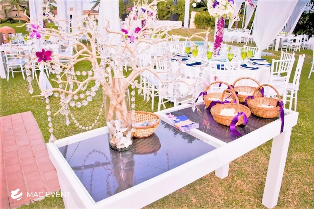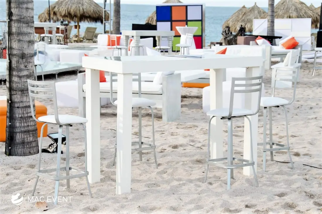 The wooden glass cocktail table combines natural beauty with modern elegance, making it a stylish choice for weddings, parties, and corporate events in Manzanillo. Its wooden base adds warmth and character, while the glass top gives a sleek, refined finish that complements any décor. This event table rental works perfectly for cocktail hours, lounge areas, or receptions where you want to create a polished yet inviting atmosphere. Renting wooden glass cocktail tables in Manzanillo ensures a cohesive setup that blends sophistication with comfort. For an event that stands out with style and balance, this table is an ideal addition.