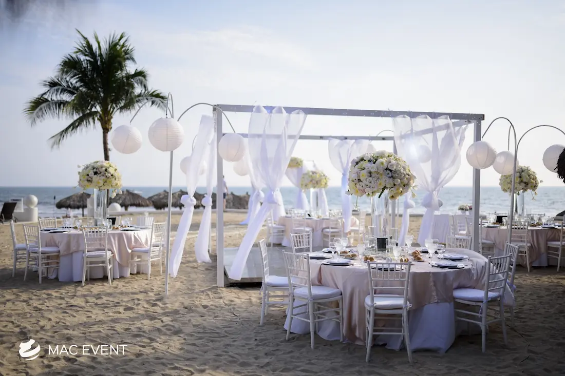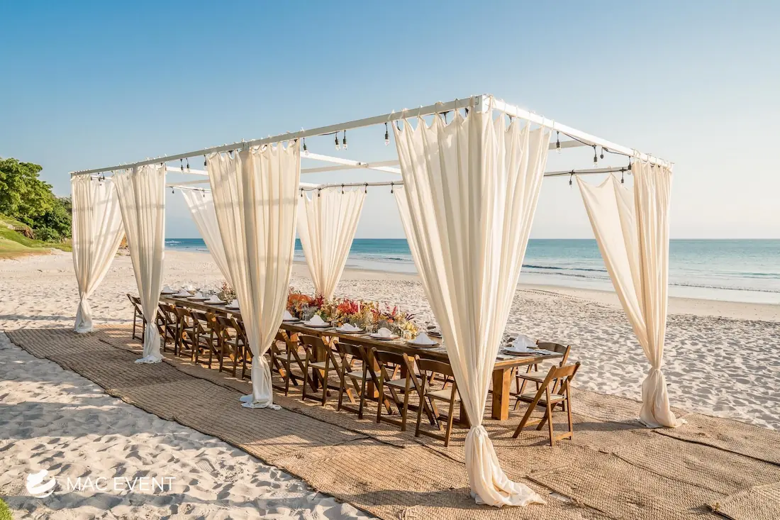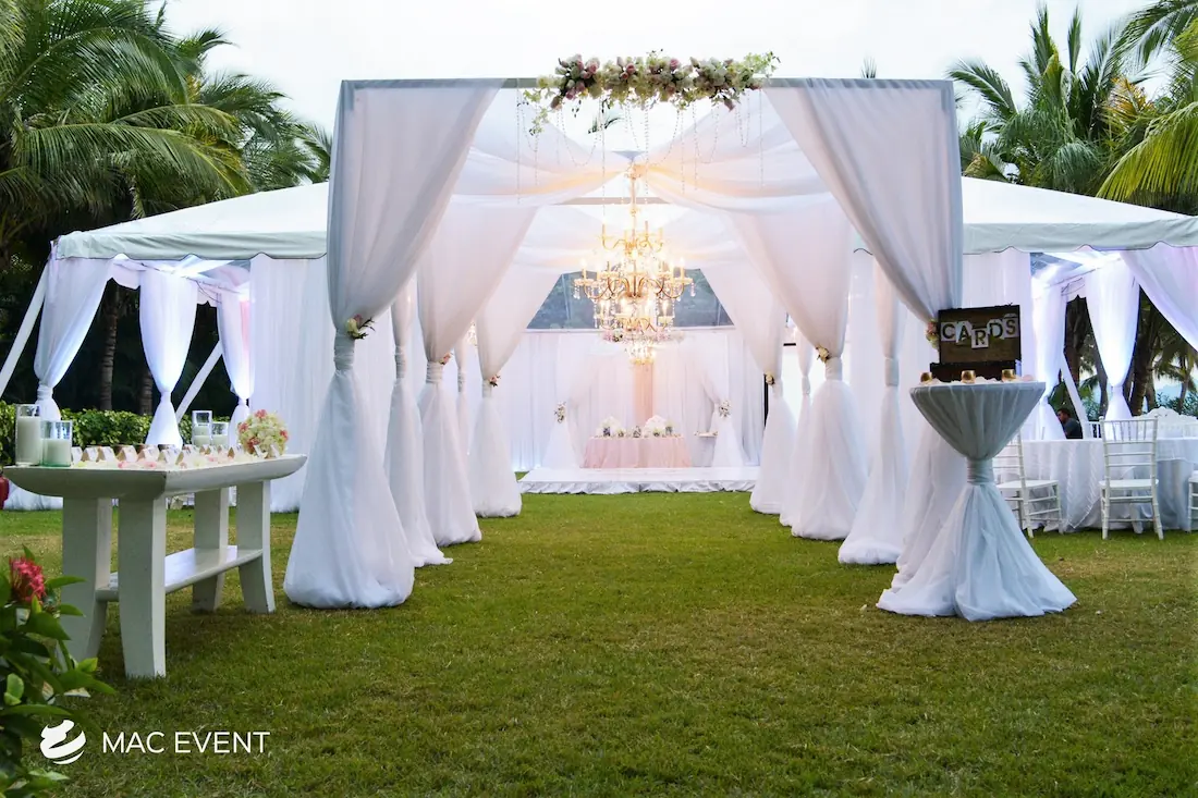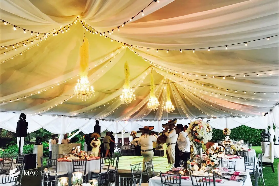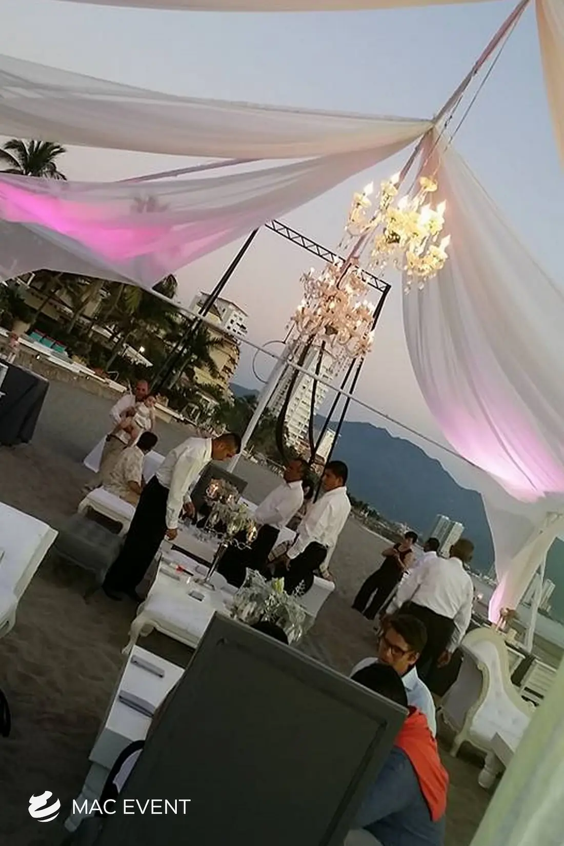 The tent draping adds elegance and softness to weddings, parties, and corporate events in Manzanillo. Designed to enhance any event tent rental, this decorative fabric transforms the structure into a luxurious and inviting space. Perfect for beach receptions, garden dinners, or formal celebrations, tent draping creates a refined atmosphere while complementing your color palette and theme. Renting tent draping in Manzanillo ensures professional installation and a cohesive, polished presentation. For a sophisticated and romantic touch that elevates your event décor, the tent draping is a beautiful addition to any setup.